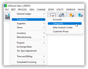• You will see options for Customer Accounts and Sales Analysis Codes. We have already covered sales analysis codes. Now, click on Customer Categories.