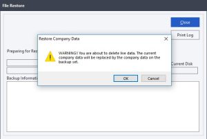 - A warning message will appear, notifying you that you are about to replace the current company data with the data from the backup. Confirm this action by clicking OK.