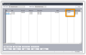 - In the transaction entry screen (e.g., journal entries, supplier invoices), you will see a field for Project Code.